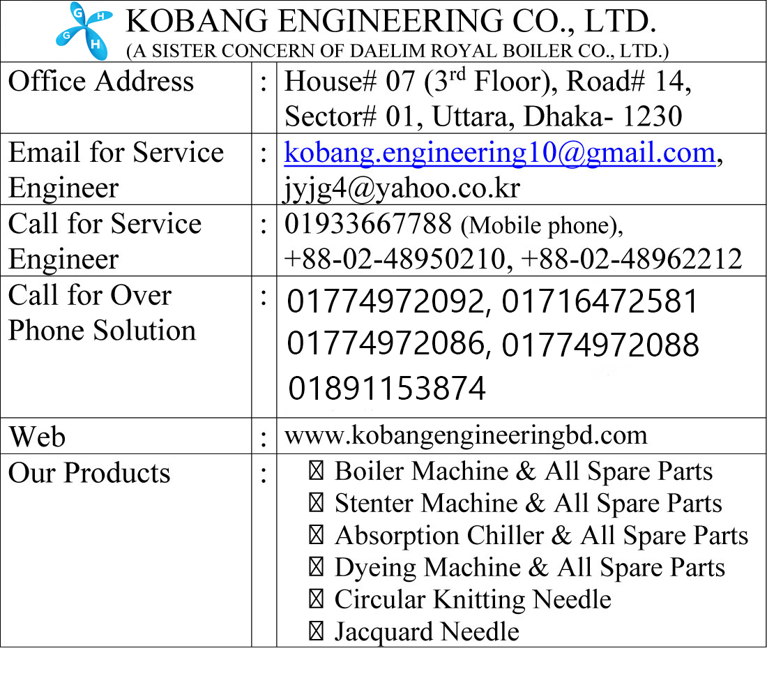 We are starting services with Industrial Boiler. After then we include other products such as_ Compressor, Stenter, Absorption Chiller, Dyeing Machine, Needles, and LPG. Our staff is available 24/7 service give to the customers. Kobang service team has 12 years of service experience and can meet the needs and requirements of the most complex boiler systems and other machinery. Good Service– making us one of the best in the world.